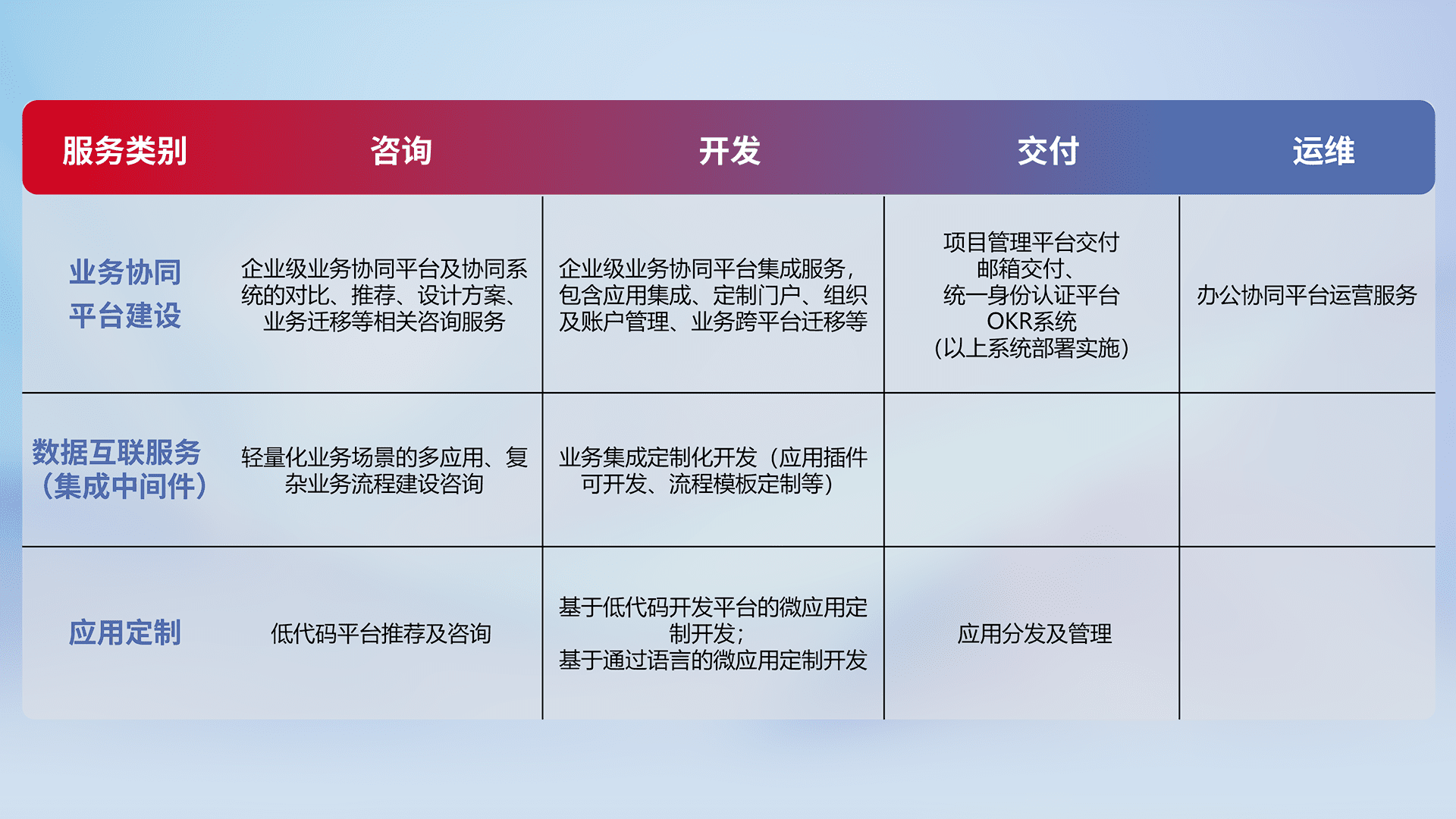 针对钉钉、、企微、、、IDaas等平台级产品提供产品的规划、、、、方案、、、交付、、定制化开发等服务,,,实现如统一协同办公、、、、智能客户服务、、混合会议管理、、、智能数据查询、、等业务场景,,,实现数字化转型。。